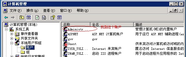 右鍵我的電腦--管理 進(jìn)入后在配置-本地用戶和組-用戶,在右側(cè)找到administrator帳戶: