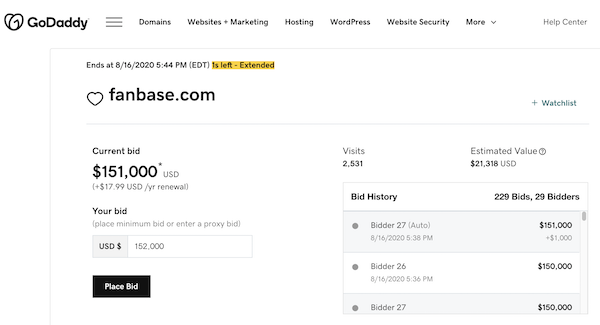 據(jù)domaininvesting消息,近日英文域名Fanbase.com在Godaddy的過期域名拍賣中以151,000美元高價(jià)結(jié)拍,折合人民幣105萬元。
