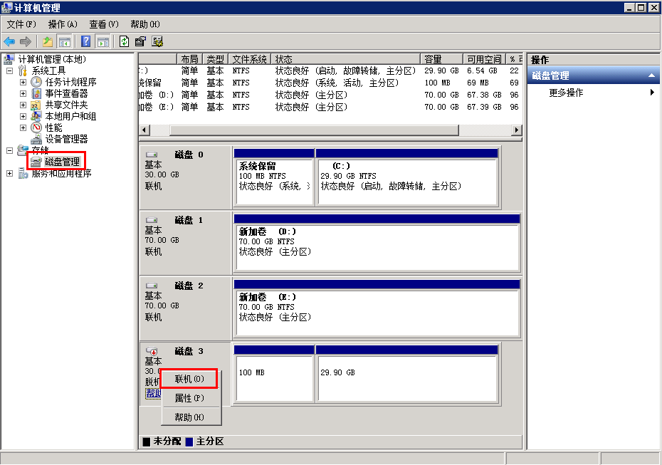 打開磁盤管理,右鍵沒有盤符的磁盤,選擇聯(lián)機即可。