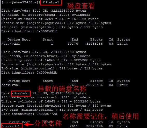 注意:掛載出來的磁盤分區(qū)一般默認(rèn)都是/dev/vdc1,在輸入mount掛載時以實(shí)際看到的分區(qū)名稱為準(zhǔn)。