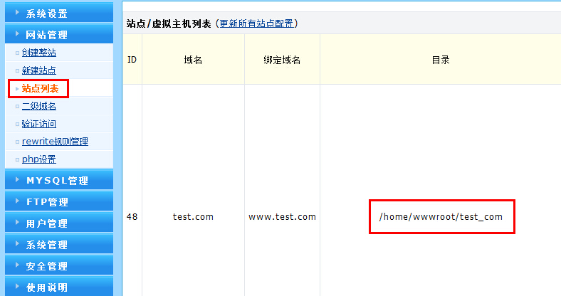 如圖所示,登錄wdcp以后點(diǎn)擊站點(diǎn)列表就可以看到網(wǎng)站具體路徑。