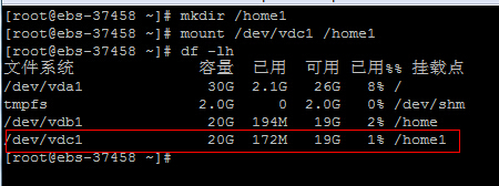 [root@ebs-37458 ~]# mount /dev/vdc1 /home1 //將備份分區(qū)掛載到home1目錄
