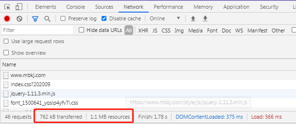 打開瀏覽器(Chrome或有高速模式的瀏覽器),打開你的網(wǎng)站,單擊F12,按下圖所示操作后,刷新一次,等其中的 transferred 數(shù)值靜止時(shí),這就是你的網(wǎng)頁(yè)全部加載的大小。