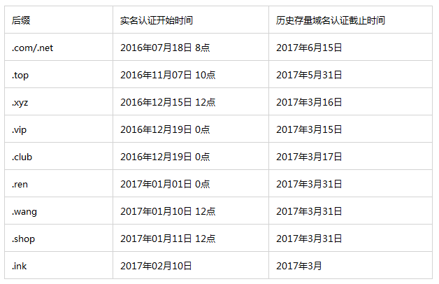3、已經注冊成功的,且沒有進行實名審核的域名,必須要在規(guī)定時間內完成實名,否則域名將會被鎖定或禁止解析,各后綴的最后期限時間表如下: